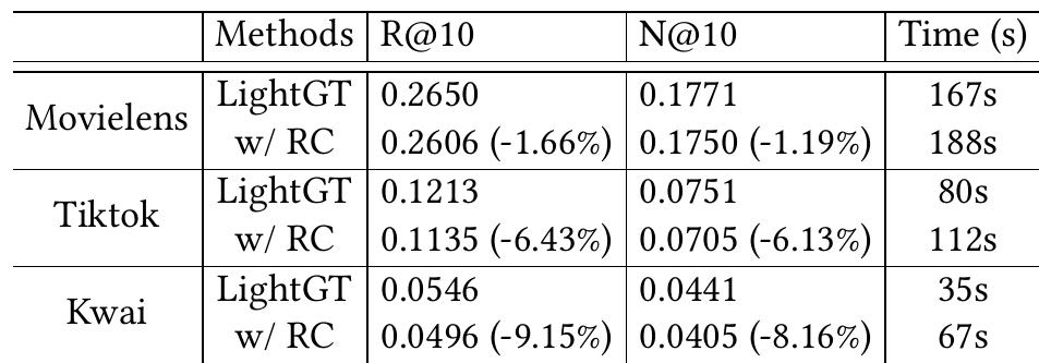 即使没有残差连接,LightGT在三个数据集上的表现也优于基线模型;并且与基线模型相比,LightGT在每个epoch花费的时间明显更少,这归功于移除了残差连接